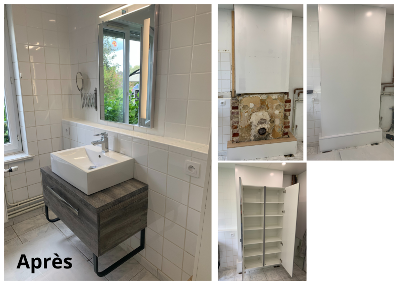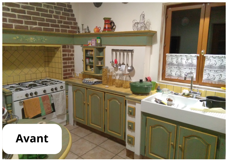 Remplacement du plan de travail (effet béton), de levier, changement de la plaque de cuisson et du four. Création d'un ilot central sur roulettes, ponçage et remise en peinture gris clair des portes et tiroirs. Remplacement des huisseries.