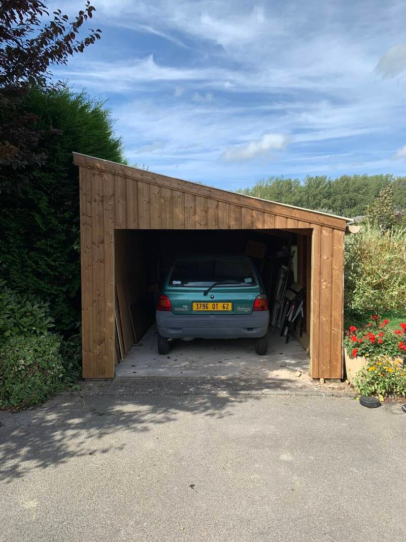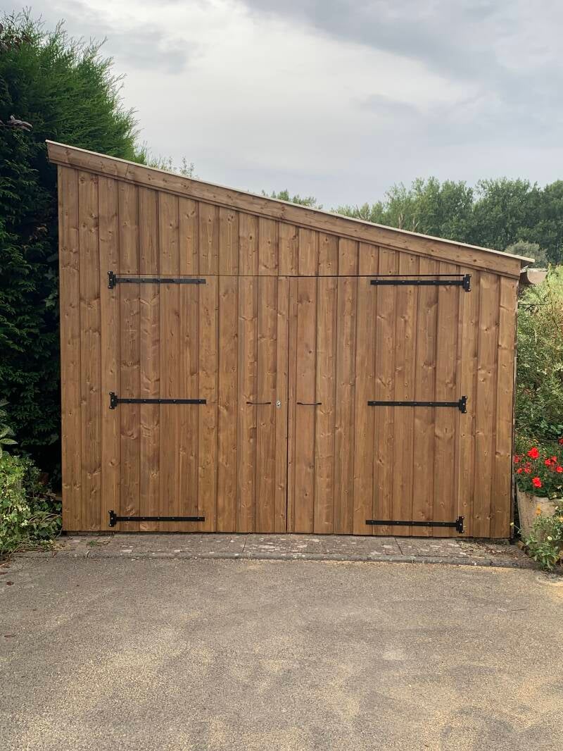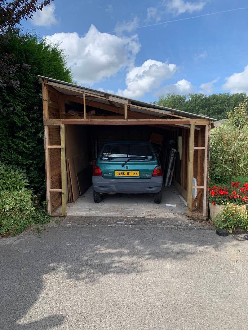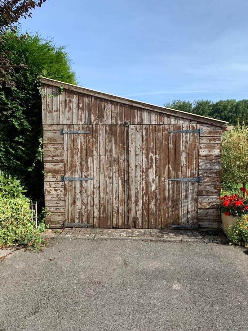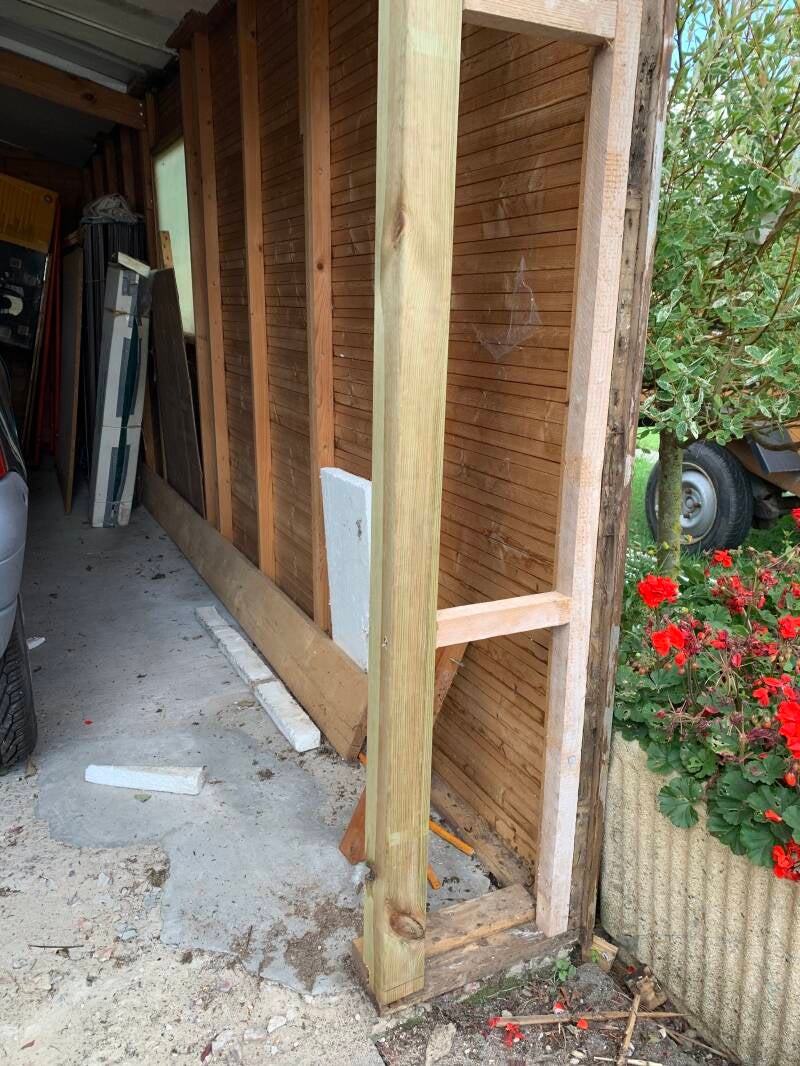 Démontage complet de la façade et des 2 ventaux, remplacement des montants (pourris) par poteaux autoclaves, création des nouveaux venteaux, remplacement des huisseries, recouvrement complet en clin douglas autoclave.