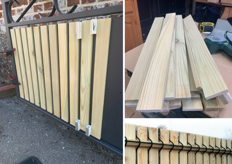 Pose d'éléments en lattes de bois autoclave en sous bassement.