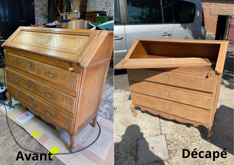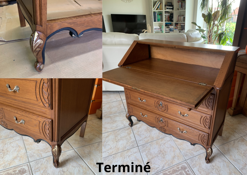 Décapage complet, ponçage, teinté Châtaigner, personnalisation filet noir et pointe de dorure sur les pieds.