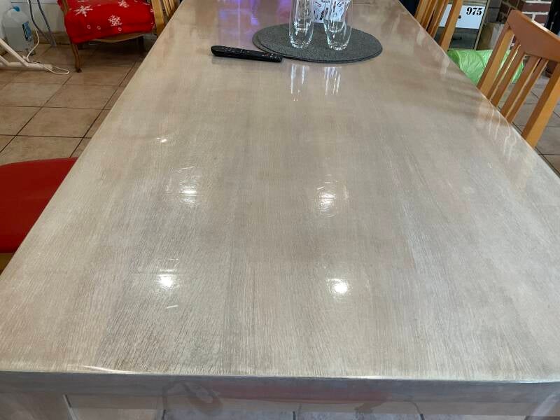 Décapage et ponçage complet, effet blanchi à l'essuyé (glycéro sable), finition vernis satin (LIBERON) en 3 couches fines.