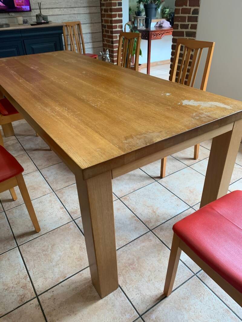 Table en hêtre massif lamellé collé, placage hêtre sur le plateau