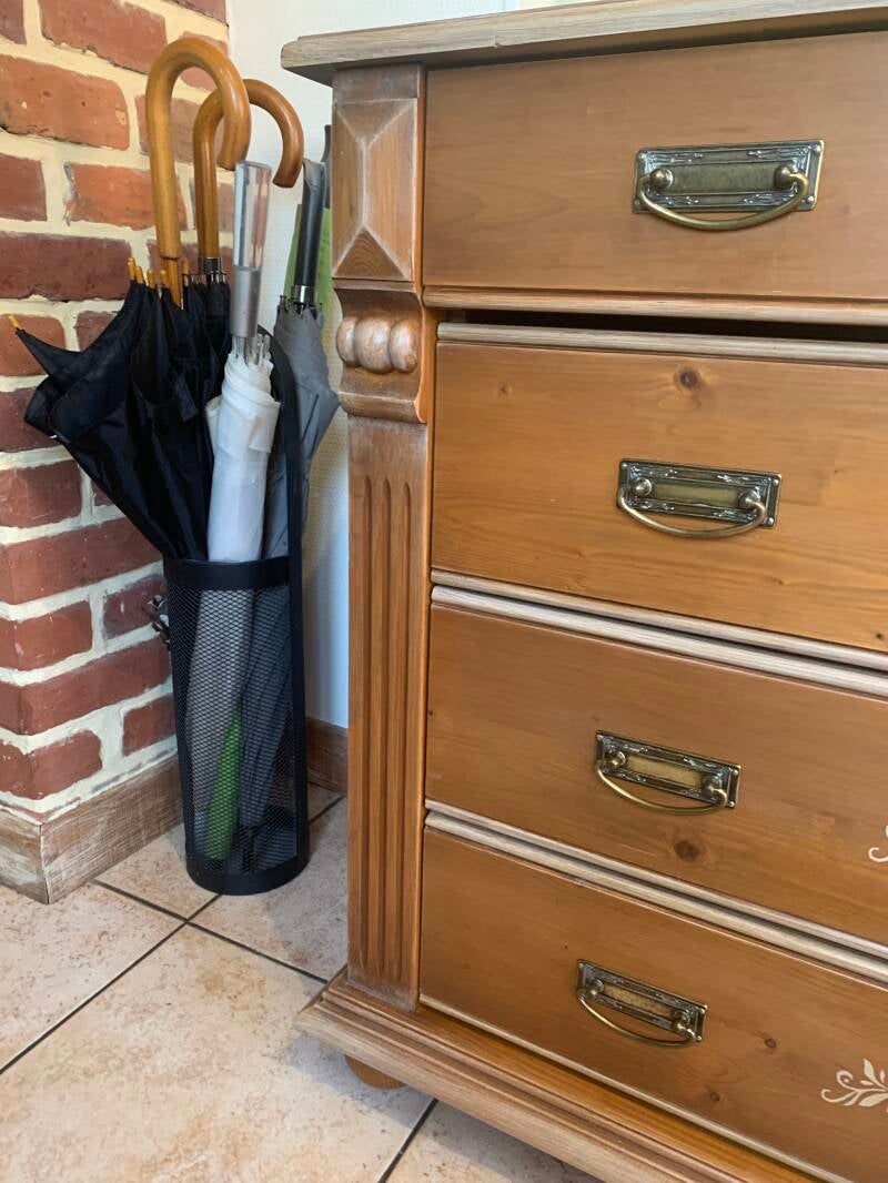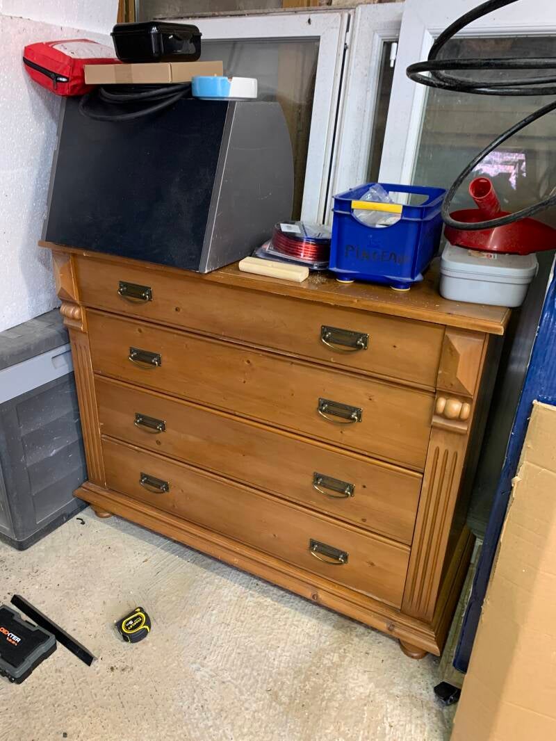 Commode en pitchpin d'inspiration Henri II chinée en brocante