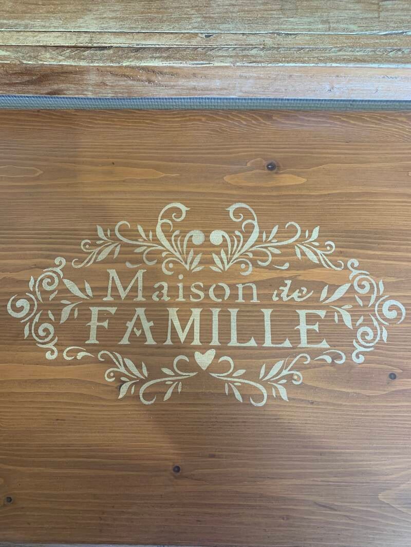 Ponçage complet, effet vieilli au chiffon, personnalisation au pochoir sur le plateau et les tiroirs, finition vernis mat en 3 couches.